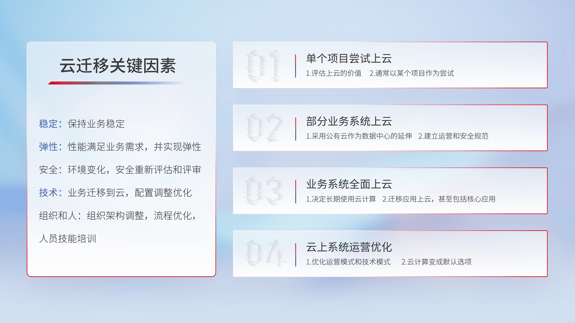 结合实际业务,,,从规划设计、、、云平台选型、、、、云原生改造、、、数据迁移、、、、集成交付,,迁移全过程为客户识别最佳上云路径,,,做好风险识别管理,,,,设计网络架构、、身份权限、、安全审计合规、、、操作审计、、、日志审计、、、监控告警策略、、、多站点容灾设计等,,,,对云上基础设施进行整体规划,,,,提升IT治理水平,,,,以满足弹性、、高可用、、、高性能的需求。。。。