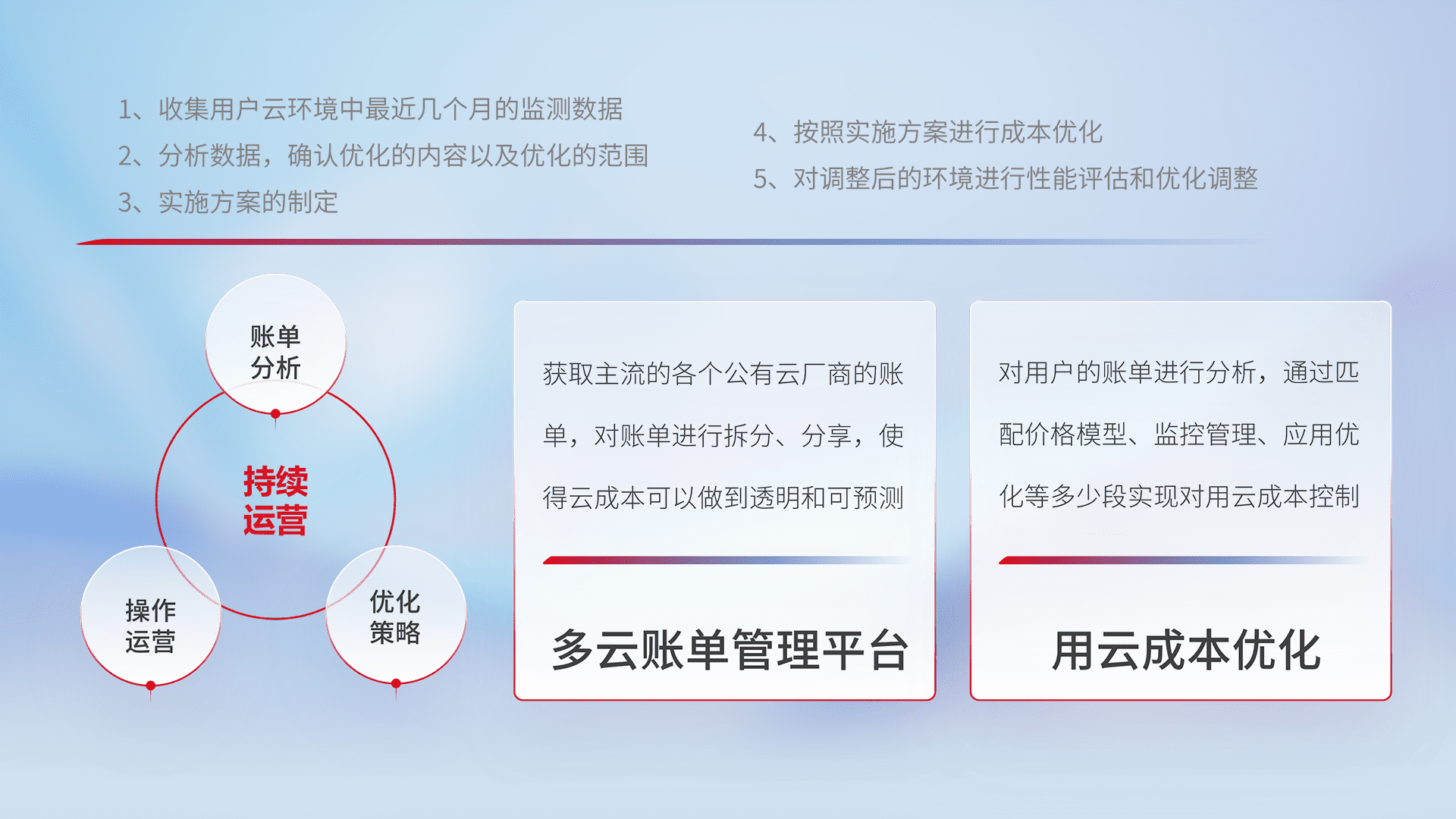 通过多云纳管,,,,以统一的资源数据模型把客户的云资源进行抽象和封装,,进而实现对多云资源的统一操作,,,保障云资源管理的可靠性、、、、稳定性与可用性。。。。量身定制化运维内容,,,配置、、开发运维、、、、补丁管理、、、备份、、监控、、、、认证和访问管理、、、、审计和日常巡检等,,,,保障在用云过程中的可靠度,,,,稳定度以及高可用率。。