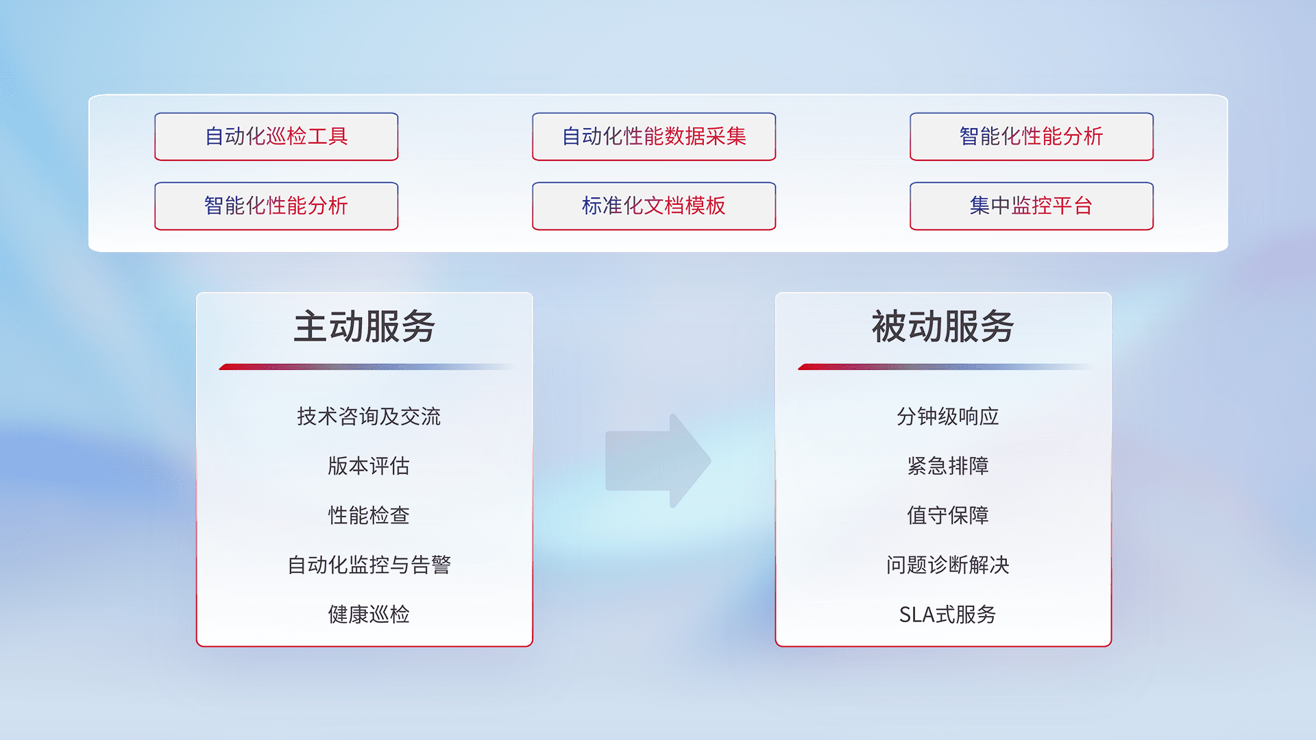 智能化工具和标准化文档,,,,保障服务质量,,提供主动服务(包含技术咨询、、版本评估、、、性能检查、、、、自动化监控与告警、、、、健康巡检)和被动服务包含(分钟级响应、、紧急排障、、、值守保障、、问题诊断解决、、、、SLA服务)。。